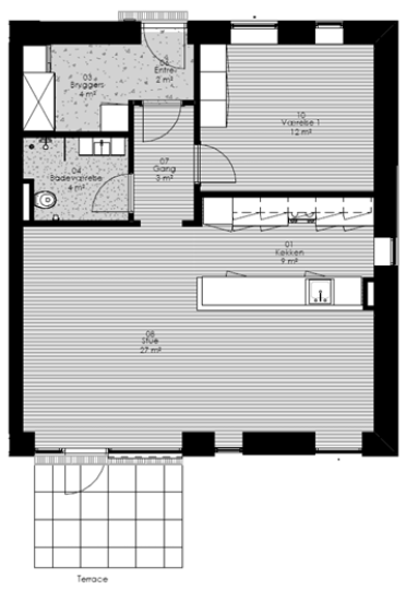 Lejligheder med indgang i stueplan har en terrasse, mens dem på 1. sal har en altan: