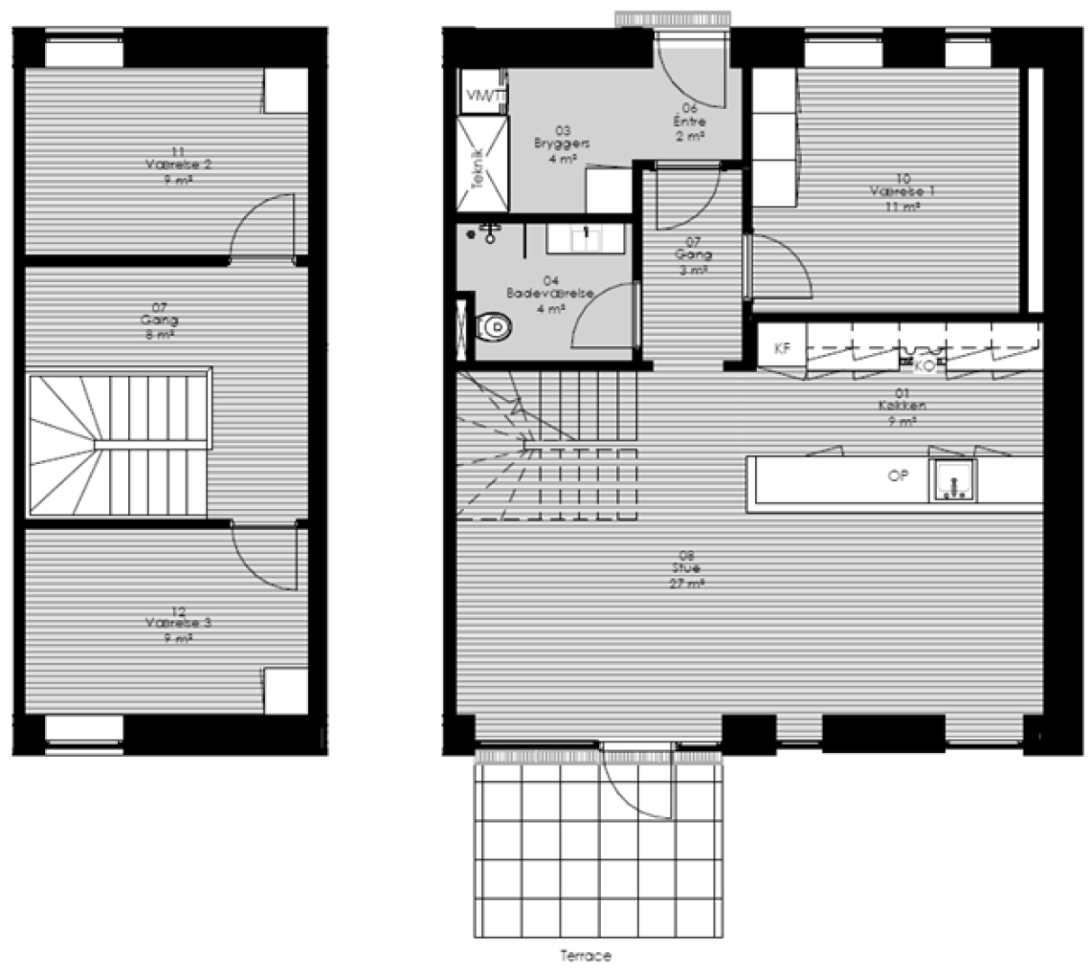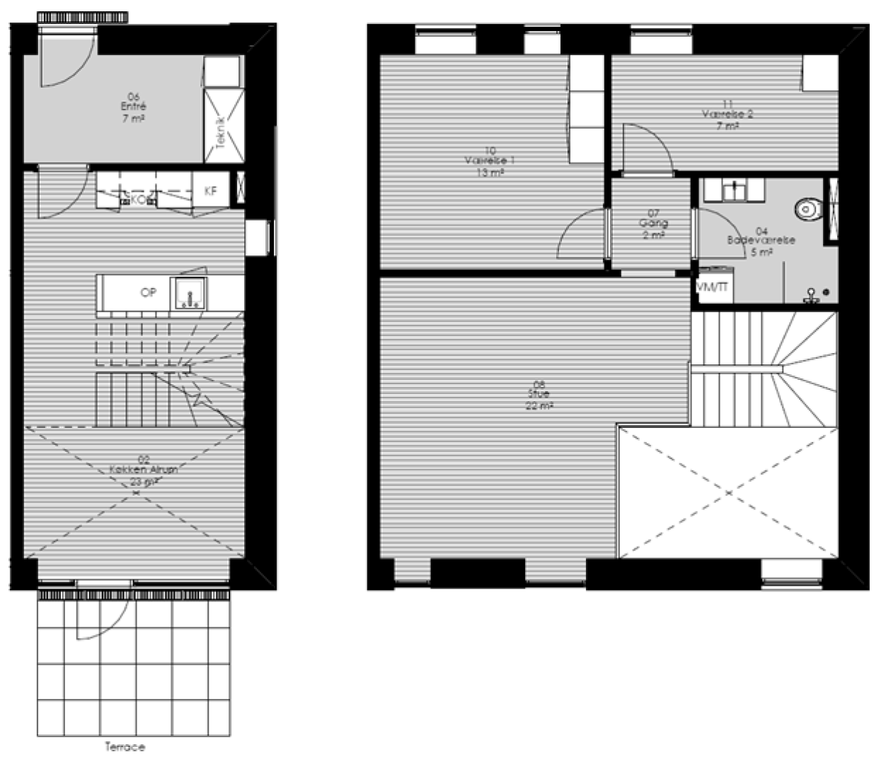 Størrelse: 84 m2 (89 m2 inkl. udvendig trappe).